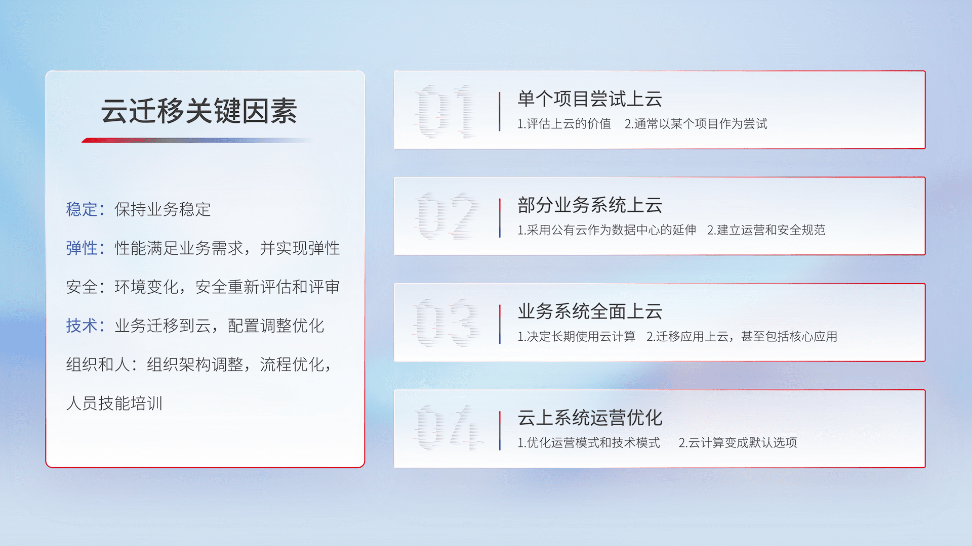 结合实际业务,,,,从规划设计、、云平台选型、、云原生改造、、数据迁移、、集成交付,,迁移全过程为客户识别最佳上云路径,,做好风险识别管理,,,设计网络架构、、、、身份权限、、、安全审计合规、、、操作审计、、、日志审计、、、、监控告警策略、、多站点容灾设计等,,,对云上基础设施进行整体规划,,,,提升IT治理水平,,,以满足弹性、、、、高可用、、、高性能的需求。。