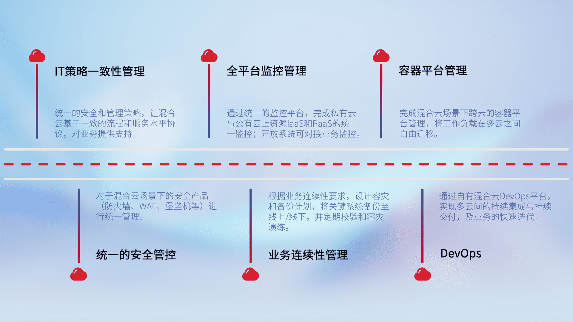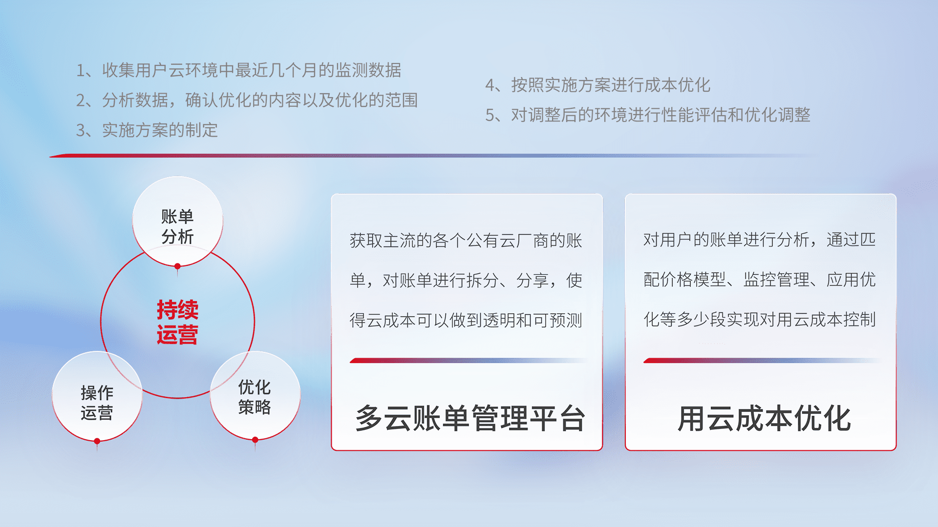 通过多云纳管,,以统一的资源数据模型把客户的云资源进行抽象和封装,,,进而实现对多云资源的统一操作,,,,保障云资源管理的可靠性、、稳定性与可用性。。量身定制化运维内容,,配置、、、、开发运维、、、、补丁管理、、、备份、、、、监控、、、认证和访问管理、、、、审计和日常巡检等,,,保障在用云过程中的可靠度,,,,稳定度以及高可用率。。。。