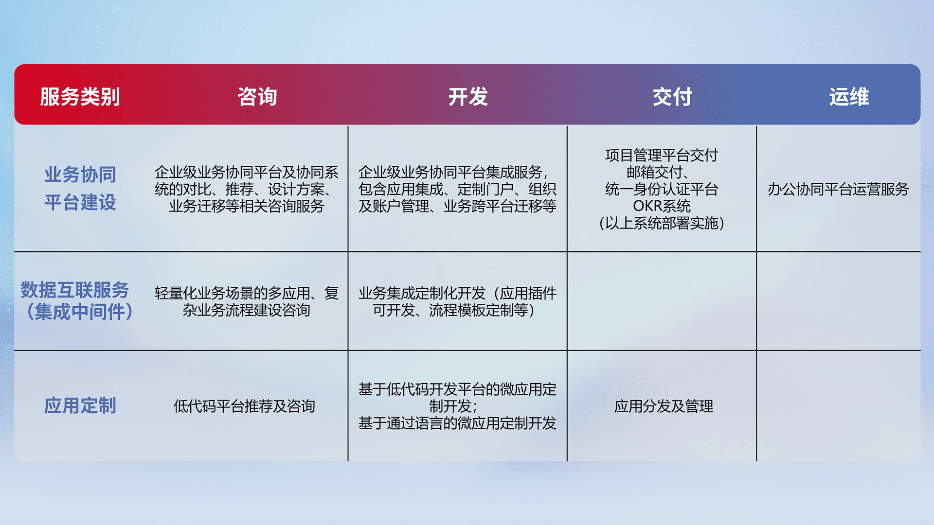 针对钉钉、、、企微、、IDaas等平台级产品提供产品的规划、、方案、、、、交付、、、、定制化开发等服务,,,,实现如统一协同办公、、、、智能客户服务、、、、混合会议管理、、智能数据查询、、、、等业务场景,,实现数字化转型。。。。
